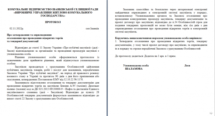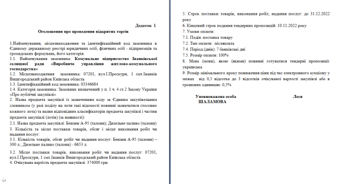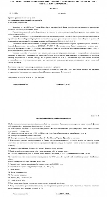 ВІДКРИТІ ТОРГИ З ОСОБЛИВОСТЯМИБензин А-95 (талони); Дизельне паливо (талони)Оприлюднення обґрунтування технічних та якісних характеристик предмета закупівлі, розміру бюджетного призначення, очікуваної вартості предмета закупівлівідповідно до п. 41 Постанови КМУ від 11 жовтня 2016 року № 710«Про ефективне використання державних коштів»1. Предмет закупівлі: за ДК 021:2015:09130000-9 – Нафта і дистиляти (Бензин А-95 (талони); Дизельне паливо (талони).2. Ідентифікатор закупівлі: UA-2022-11-02-010530-а3. Обґрунтування технічних та якісних характеристик предмета закупівлі:Технічні, якісні та кількісні характеристики предмета закупівлі визначені відповідно до потреб Замовника з урахуванням вимог законодавства та зазначені в оголошені до відкритих торгів з особливостями. Технічне завдання передбачено Додатком 3 до Тендерної документації.4. Обґрунтування розміру бюджетного призначення та очікуваної вартості предмета закупівлі:розмір додаткового бюджетного призначення для закупівлі: Бензин А-95 (талони); Дизельне паливо (талони) складає 374 000 грн. з ПДВ. Запланований обсяг – Бензин А-95 (талони)- 300 л.; Дизельне паливо (талони)- 6653 л.5. Очікувана вартість предмета закупівлі становить: 374 000 (триста сімдесят чотири тисячі грн.) гривень.